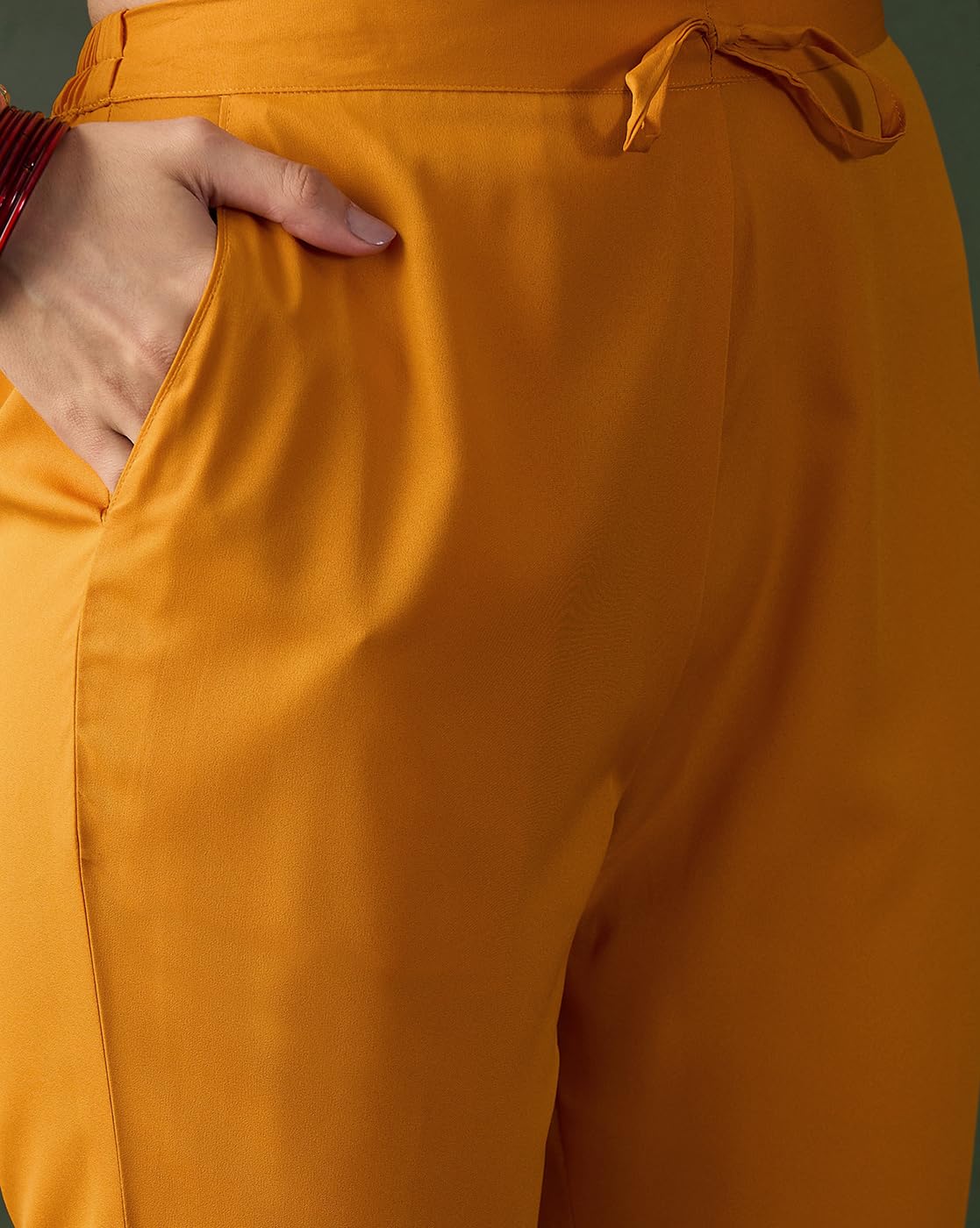 The SheWill Women's Mustard American Crepe Kurta showcases exquisite zari sequence embroidery with a chic alia cut. Ideal for festive occasions or formal events, this vibrant outfit comes complete with a matching pant and dupatta, blending elegance with modern flair.